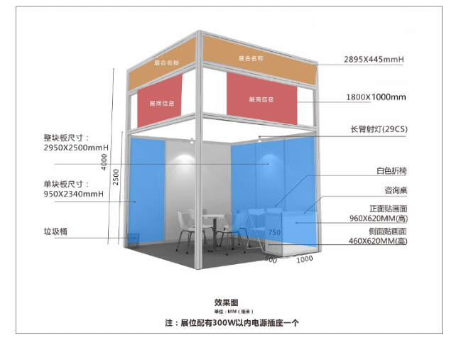 ■标准展位费用包括:展出场地、2.5m高壁板、楣牌制作、9平方米地毯、洽谈桌一张、椅子二把、10A/220V 单相插座一个,射灯二支。 ■空场地不带任何展架及设施,参展商可自行安排特殊装修工作或委托组织单位推荐的搭建公司。 标准展台示意图: